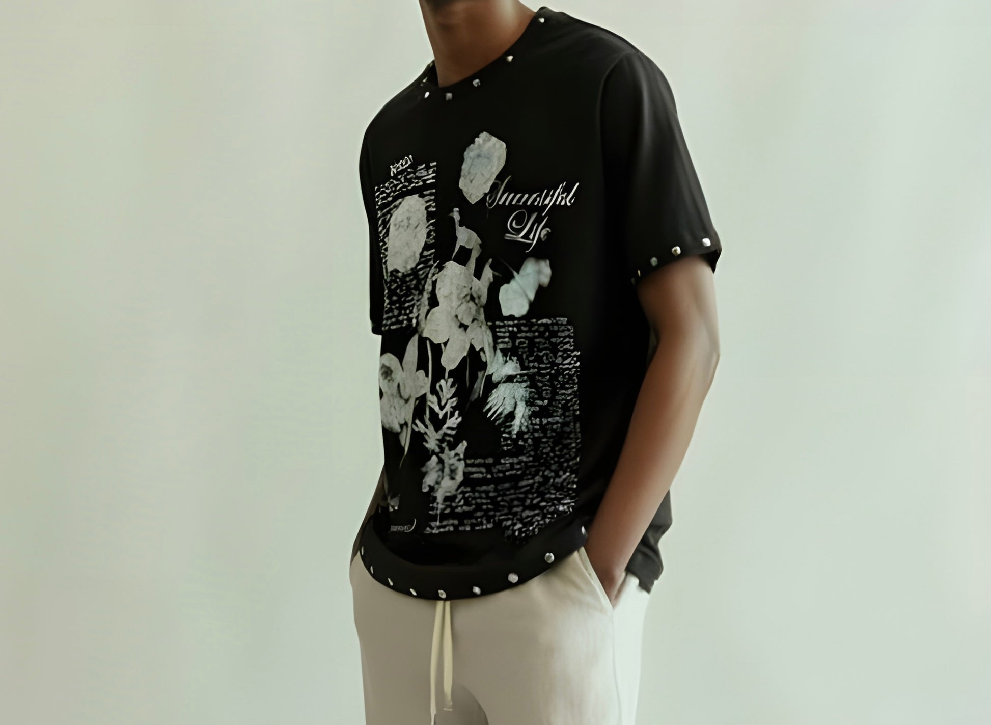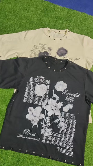 Step into confidence and creativity with the Successful Life “Roses” Tee — a statement piece that blends premium quality with bold streetwear energy. This short-sleeve shirt features custom metal plates around the neckline, sleeves, and hem, giving it a distinctive designer edge and an elevated, luxury feel.